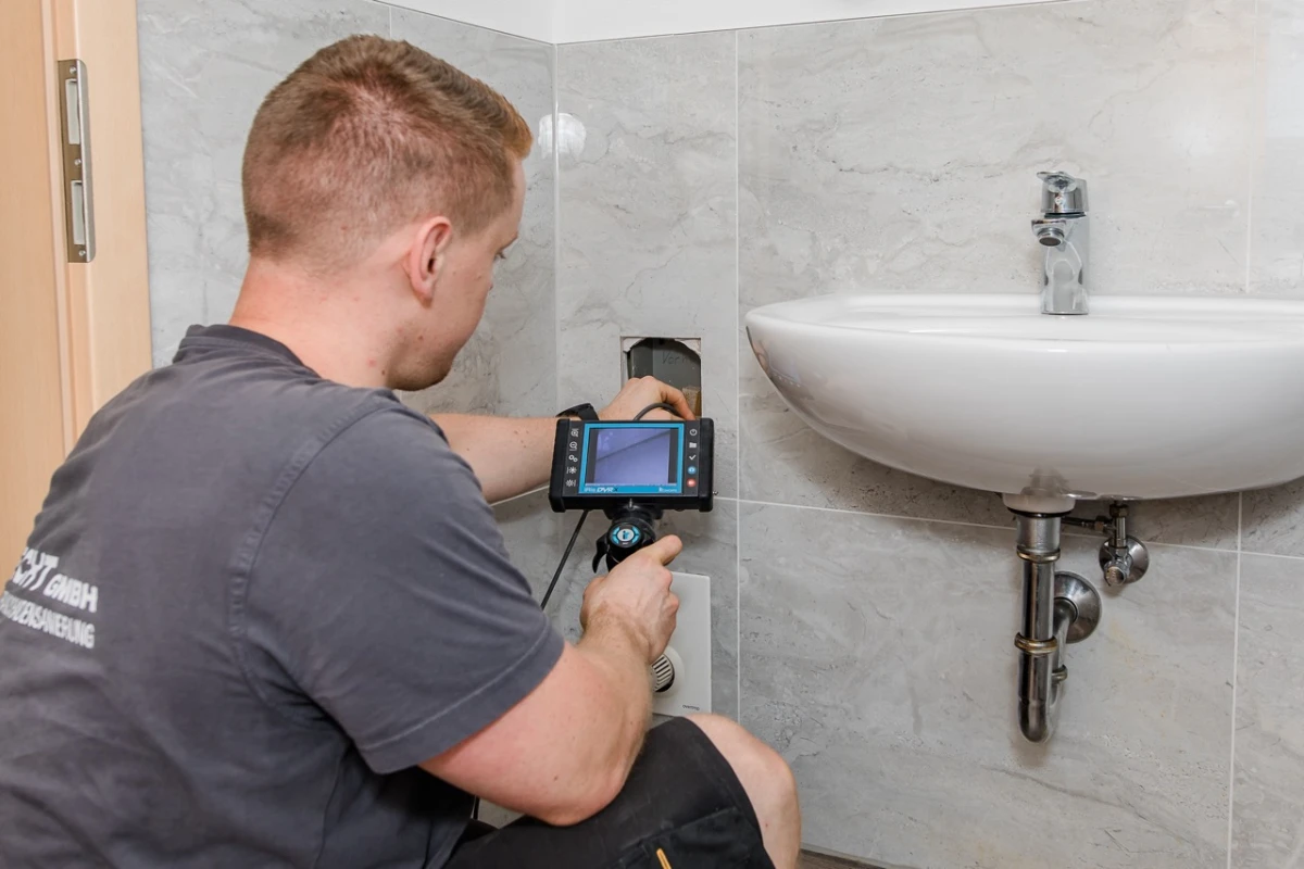 Die Endoskopie-Leckortung wird bei Hohlräumen oder schwer zugänglichen Bereichen durchgeführt, wie zum Beispiel bei Trockenbauwänden oder abgehängten Decken. Das Endoskop ermöglicht es mit Hilfe einer Lichtquelle und einer Kamera, die Innenwände der Strukturen zu inspizieren und nach Anzeichen von Lecks, Rissen, Korrosion oder anderen Schäden zu suchen.