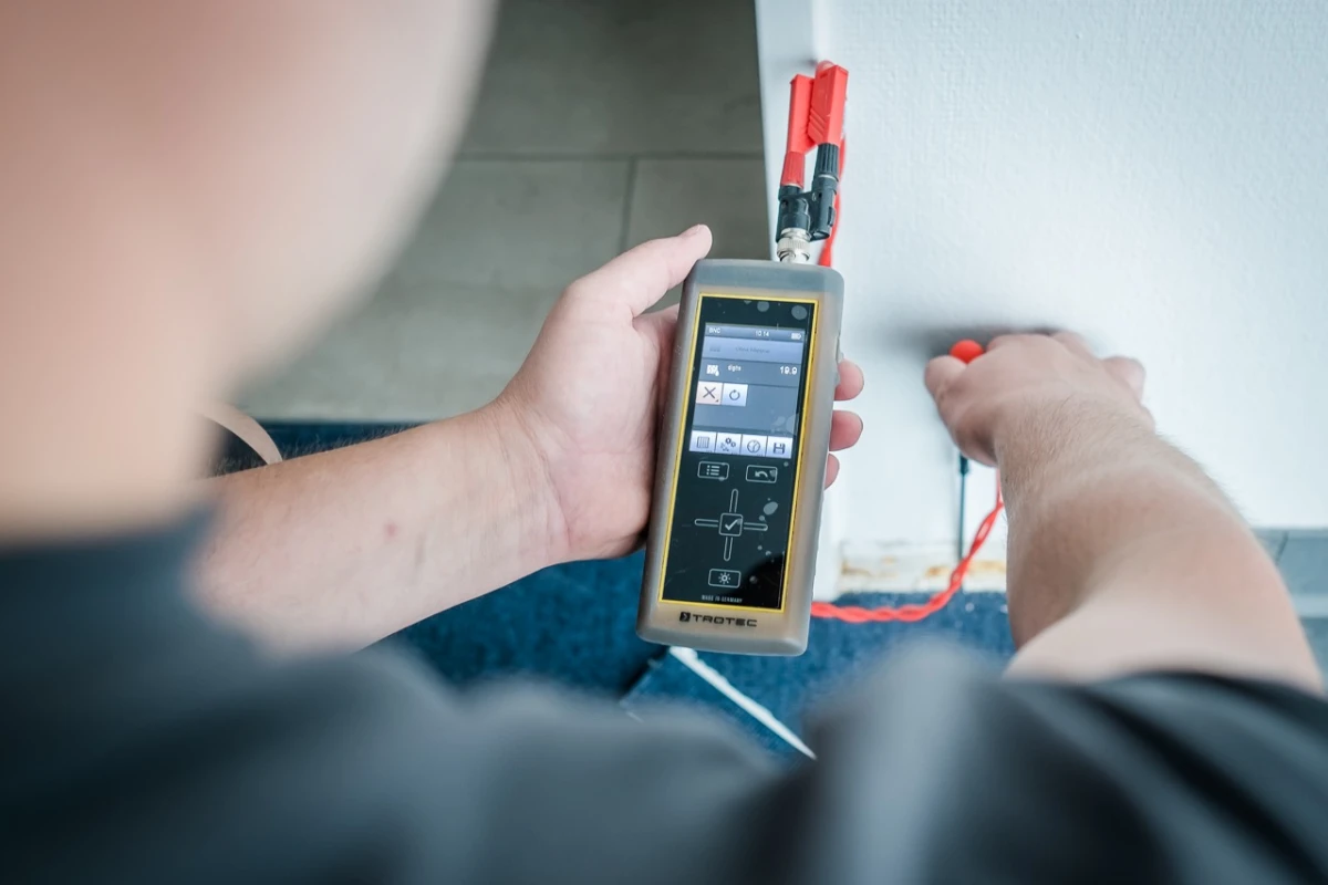 Anhand einer Feuchtigkeitsmessung ist für uns erkennbar, wie weit sich die Feuchtigkeit in Böden, Wänden und Decken verbreitet hat, woraufhin sich der Trocknungstechniker vor Ort einen groben Überblick zur Struktur des Trocknungsaufbaus verschafft.
